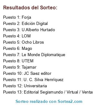 Lista de participantes: Le Monde Diplomatique, U.Alberto Hurtado, Universitaria, LOM, Ocho Libros, U. C. Silva Henríquez, JC Saez editor, Tajamar, UTEM, Editorial Segismundo / Virtual / Ventana Abierta, Forja, Mago, Edición Digital.