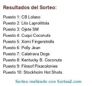 Lista de participantes: Xomi Fingerstrolls, Lito Laprolittola, Kentucky B. Coconuts, CB Lolaso, Polly Jean, Ojete SM, Filosof Pixacolonies, Stockholm Hot Shots, Calatrava Dogs, Cuqui Coconuts.