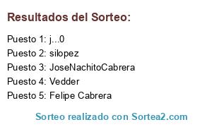 Lista de participantes: Terracotaspin, Yuux, ganbre, Vedder, pakitogb, dolanpls, Van Belisario, SARPAO, vencer o morir, Teeteto, silopez, PotroMania, Vader12345, BlaxzteR, David Cruz Cruz, Benzo Diazepino, JoseNachitoCabrera, Loba esteparia, Crxza, Felipe Cabrera, j...0, Wauro21, Mr. Schuffe.