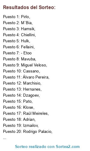 Lista de participantes: Witsel,, Di Natale,, David Luiz,, Mata,, Juanfran, Pirlo,, Cassano,, Chiellini,, Marchisio,, Sneijder,, Gargano,, Álvaro Pereira,, Cardozo,, Gomis,, Rodrigo Palacio,, Papiss Cissé,, Tioté,, Fellaini,, Mavuba,, Huuntelar,, Lamela,, Adrian,, Robinho,, Valbuena,, Rémy,, M´Bia,, Drogba, Hamsik,, Dzagoev,, Doumbia,, Honda,, Capel,, Izmailov,, Miguel Veloso,, Raúl Meireles,, Felipe Melo,, Negredo,, Trezeguet,, Klose,, Hernanes,, Martins, - Falcao, - Cazorla, - Walcott, - Etoo, Cavani,, Pato,, Giovinco,, Hulk,, Trochowski, Stegen, Walker.