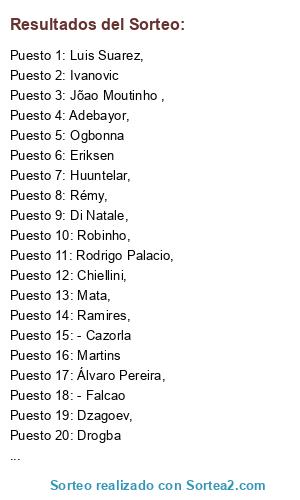 Lista de participantes: Jõao Moutinho ,, Witsel,, Di Natale,, Ogbonna, David Luiz,, Ramires,, Mata,, Juanfran, Pirlo,, Cassano,, Chiellini,, Marchisio,, Sneijder,, Gargano,, Álvaro Pereira,, Cardozo,, Michel Bastos,, Gomis,, Rodrigo Palacio,, Papiss Cissé,, Tioté,, Fellaini,, Mavuba,, Huuntelar,, Lamela,, Adrian,, Robinho,, Adebayor,, Eriksen, Mandanda,, Valbuena,, Rémy,, M´Bia,, Drogba, Hamsik,, Dzagoev,, Doumbia,, Honda,, Ivanovic, Capel,, Izmailov,, Miguel Veloso,, Raúl Meireles,, Felipe Melo,, Negredo,, Trezeguet,, Beñat,, Klose,, Hernanes,, Martins, - Falcao, - Cazorla, - Walcott, - Etoo, Cavani,, Pato,, Giovinco,, Hulk,, Hazard,, Luis Suarez,, Cech, , Ashley Cole,, Walker.