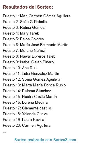 Lista de participantes: Clemente castillo, María José Belmonte Martín, Pelos Colores, Merche Nuñez, Lorena Medina, Retina Gómez, Vanessa Lechado, Marta María Ponce Rubio, Alejandra Masa López, Noelia Castle Martín, Sofia G Rebollo, Paloma Sánchez, Aurora Ruiz Seco, Carmen Aguilera, Ana Ruiz, Mari Carmen Gómez Aguilera, Lidia González Martín, Sonia Gómez Aguilera, Sara Gómez Pérez, Isabel Galan Piñero, Yolanda Cueva, Nawal Libreros Taleb, Marta Jiménez Palomera, Mary Tarek, Laura Revilla.