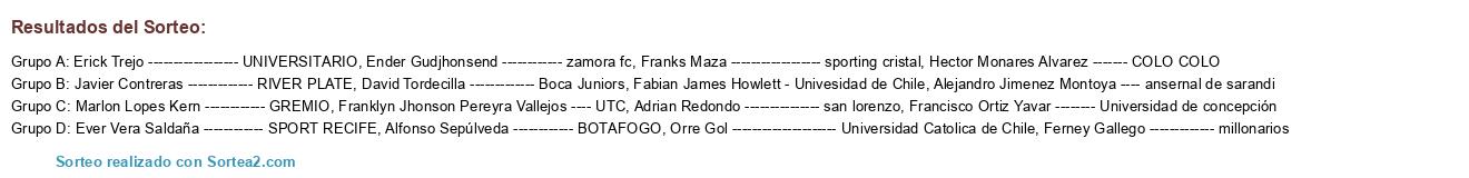 Lista de participantes: Erick Trejo ------------------ UNIVERSITARIO, Alfonso Sepúlveda ------------ BOTAFOGO, Franks Maza ------------------ sporting cristal, Adrian Redondo --------------- san lorenzo, Ender Gudjhonsend ------------ zamora fc, Alejandro Jimenez Montoya ---- ansernal de sarandi, Orre Gol --------------------- Universidad Catolica de Chile, Marlon Lopes Kern ------------ GREMIO, Franklyn Jhonson Pereyra Vallejos ---- UTC, David Tordecilla ------------- Boca Juniors, Hector Monares Alvarez ------- COLO COLO, Ferney Gallego ------------- millonarios, Francisco Ortiz Yavar -------- Universidad de concepción, Fabian James Howlett - Univesidad de Chile, Javier Contreras ------------- RIVER PLATE, Ever Vera Saldaña ------------ SPORT RECIFE.
