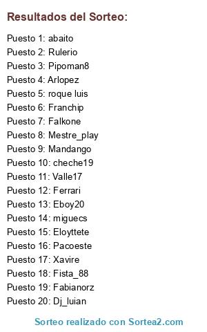Lista de participantes: Valle17, Fista_88, Arlopez, Mandango, Dj_luian, Fabianorz, Falkone, Pipoman8, Pacoeste, Mestre_play, Rulerio, cheche19, Xavire, Ferrari, Franchip, miguecs, Eboy20, Eloyttete, roque luis, abaito.