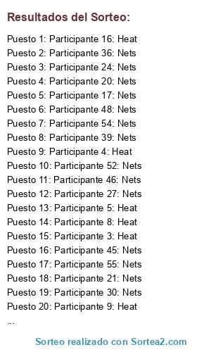 Lista de participantes: Participante 1: Heat, Participante 2: Heat, Participante 3: Heat, Participante 4: Heat, Participante 5: Heat, Participante 6: Heat, Participante 7: Heat, Participante 8: Heat, Participante 9: Heat, Participante 10: Heat, Participante 11: Heat, Participante 12: Heat, Participante 13: Heat, Participante 14: Heat, Participante 15: Heat, Participante 16: Heat, Participante 17: Nets, Participante 18: Nets, Participante 19: Nets, Participante 20: Nets, Participante 21: Nets, Participante 22: Nets, Participante 23: Nets, Participante 24: Nets, Participante 25: Nets, Participante 26: Nets, Participante 27: Nets, Participante 28: Nets, Participante 29: Nets, Participante 30: Nets, Participante 31: Nets, Participante 32: Nets, Participante 33: Nets, Participante 34: Nets, Participante 35: Nets, Participante 36: Nets, Participante 37: Nets, Participante 38: Nets, Participante 39: Nets, Participante 40: Nets, Participante 41: Nets, Participante 42: Nets, Participante 43: Nets, Participante 44: Nets, Participante 45: Nets, Participante 46: Nets, Participante 47: Nets, Participante 48: Nets, Participante 49: Nets, Participante 50: Nets, Participante 51: Nets, Participante 52: Nets, Participante 53: Nets, Participante 54: Nets, Participante 55: Nets, Participante 56: Nets.