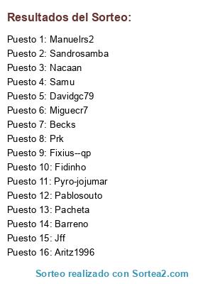 Lista de participantes: Fidinho, Manuelrs2, Aritz1996, Jff, Fixius--qp, Nacaan, Pacheta, Samu, Prk, Pyro-jojumar, Becks, Pablosouto, Davidgc79, Miguecr7, Sandrosamba, Barreno.