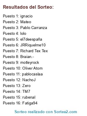 Lista de participantes: Oliver Atom, Pablo Carranza, lolo, Fatiga94, ignacio, NachoJ, JRRiquelme10, motleyrock, Braian.-, TM7, Mateo, rubenal, Richard Tex Tex, Zero, pablocaslaa, el7deespaña.