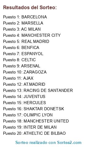 Lista de participantes: SHAKTAR DONETSK, ATHELTIC DE BILBAO, BENFICA, MANCHESTER CITY, BARCELONA, JUVENTUS, ARSENAL, MARSELLA, MANCHESTER UNITED, OLIMPIC LYON, AT.MADRID, CELTIC, AC MILAN, AJAX, RACING DE SANTANDER, HERCULES, INTER DE MILAN, ZARAGOZA, REAL MADRID, ESPANYOL.