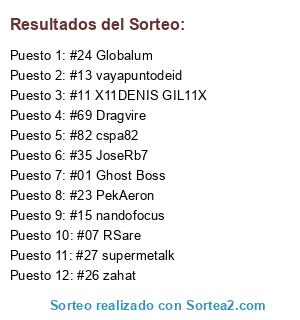 Lista de participantes: #69 Dragvire, #11 X11DENIS GIL11X, #26 zahat, #35 JoseRb7, #13 vayapuntodeid, #23 PekAeron, #82 cspa82, #01 Ghost Boss, #07 RSare, #15 nandofocus, #24 Globalum, #27 supermetalk.