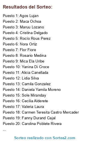 Lista de participantes: Maarty Riivera, Romina Arce, MeeLy Suarez, Paola Gomes, Stefania Drebnieks, Graciela Dipasquale, Moni Giacome, San Dris, Florencia Cepeda(2 participaciones), Lole Sanabria, Diana Wright, Jesi Garcia, Mary Rose, Ivis Barboza, Elida Molina, Clau Camusso, Estela Escobar, Lidia Silva(2 participaciones), Valeria Laura(2 participaciones), Christian Pablo, Marina Marino(2 participaciones), María Belen Varela(2 participaciones), Flor Fiore(2 participaciones), Soophito Benitez(2 participaciones), JJacquie Michel, Nora Ortiz(2 participaciones), Eliana Rodriguez(2 participaciones), Sol Nerli(2 participaciones), Belen Ochoa(2 participaciones), Maria Lu(3 participaciones), Maca Ochoa(2 participaciones), Analia Diaz, Laura Flor, Meli de la Flor, Agos Lujan(3 participaciones), Alicia Canellada, Camila Gonzalez, Sole Miranday(2 participaciones), Sol Cutinella, Ana Emilce Ruiz, Belen Boo(2 participaciones), Nadia Crosa, Mady Luna(2 participaciones), Ayelén Miramontes, Cristina Delgado(2 participaciones), Lilian Rubio, Mel Torres, Mica Aguilera, Guadalupe Elizabeth, Barbara Ayelen, Fiorella Giarmoli Vandendorp(2 participaciones), Chiara Napoli(2 participaciones), Laura Pagella, Rocío Rous Perez, Sergio Amanda Aguilera, Micaela Martínez, Fanny Durand Cajal, Lourdes Natali Lazarte, Maria Belen Sarraute, Aldana Belen Gonzalez, Rocio Gonzalez, Andru Mv, Dani Rendón, Daniela Yamila Moreno, Estella Maris Morales, Mar Sayago, Valeria Calvo, Melanie Russo, Araceli Cárcamo, Yohana Honcharuk, Belen Bustelo, Maria Elena, Lu Carderole, Cecilia Alderete, Carolina Poblete Rivera, Mónica Delia Huaygua, Nadia Stephanía Gil, Adri Perez, Maruu Lozano, Karen Miranda, Mica Ela Uribe, Rosario Medina, Camila Belen Alaniz, La Lola Lmds, Agus Almiron, Guillermina Esteche, Ingrid Cejas, Roo Dorao, Aye Jony, Camila Solange, Maria Elvira Calvo, Carmen Teresita Castro Mercader, Luly Callio, Tamara Jacques, Cami Mendez, Brenda Rios, Florencia Noelia Amoleo, Sofia Ormeyo, Luciana Alma Arce, Caro Pineda, Sofia Villalba Gimenez, Mariana Lopez, Flavia Luna, Jacqueline Lazarte, Yanina Di Croce, Paola Gomez, Karen Swam, Patricia Mina, May Juárez, Mica Donoso.