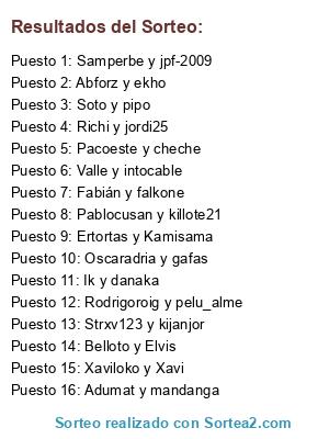 Lista de participantes: Belloto y Elvis, Pablocusan y killote21, Fabián y falkone, Samperbe y jpf-2009, Oscaradria y gafas, Xaviloko y Xavi, Valle y intocable, Pacoeste y cheche, Rodrigoroig y pelu_alme, Adumat y mandanga, Abforz y ekho, Strxv123 y kijanjor, Ertortas y Kamisama, Soto y pipo, Richi y jordi25, Ik y danaka.