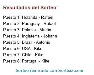 Lista de participantes: USA - Kike, Chile - Kike, Portugal - Kike, Paraguay - Rafael, Holanda - Rafael, Brazil - Antonio, Polonia - Martin, Inglaterra - Johann.
