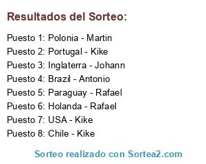 Lista de participantes: USA - Kike, Chile - Kike, Portugal - Kike, Paraguay - Rafael, Holanda - Rafael, Brazil - Antonio, Polonia - Martin, Inglaterra - Johann.