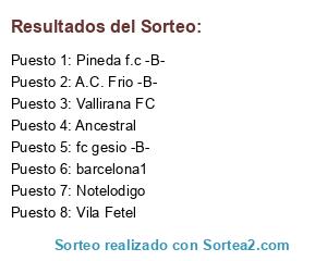 Lista de participantes: Notelodigo, Ancestral, fc gesio -B-, Pineda f.c -B-, A.C. Frio -B-, barcelona1, Vallirana FC, Vila Fetel.