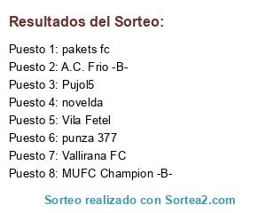 Lista de participantes: Vallirana FC, novelda, MUFC Champion -B-, A.C. Frio -B-, Pujol5, punza 377, pakets fc, Vila Fetel.