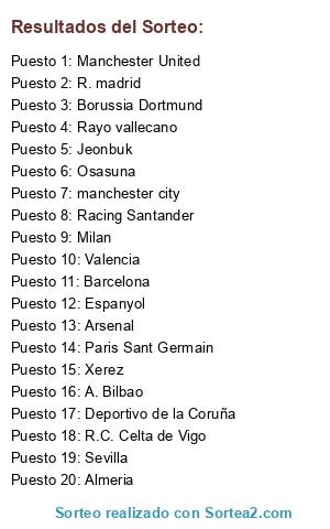 Lista de participantes: Almeria, Racing Santander, Paris Sant Germain, Sevilla, Deportivo de la Coruña, Manchester United, Borussia Dortmund, Rayo vallecano, Milan, Xerez, R.C. Celta de Vigo, Arsenal, Valencia, Jeonbuk, Osasuna, manchester city, R. madrid, A. Bilbao, Espanyol, Barcelona.