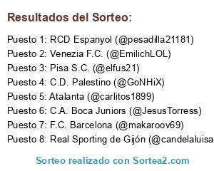 Lista de participantes: Venezia F.C. (@EmilichLOL), RCD Espanyol (@pesadilla21181), Real Sporting de Gijón (@candelaluisa), Atalanta (@carlitos1899), C.A. Boca Juniors (@JesusTorress), F.C. Barcelona (@makaroov69), C.D. Palestino (@GoNHiX), Pisa S.C. (@elfus21).