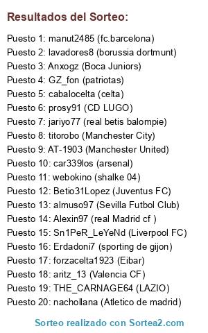 Lista de participantes: jariyo77 (real betis balompie), almuso97 (Sevilla Futbol Club), manut2485 (fc.barcelona), AT-1903 (Manchester United), nachollana (Atletico de madrid), titorobo (Manchester City), THE_CARNAGE64 (LAZIO), Sn1PeR_LeYeNd (Liverpool FC), Betio31Lopez (Juventus FC), car339los (arsenal), Anxogz (Boca Juniors), cabalocelta (celta), lavadores8 (borussia dortmunt), forzacelta1923 (Eibar), prosy91 (CD LUGO), Alexin97 (real Madrid cf ), GZ_fon (patriotas), webokino (shalke 04), aritz_13 (Valencia CF), Erdadoni7 (sporting de gijon).