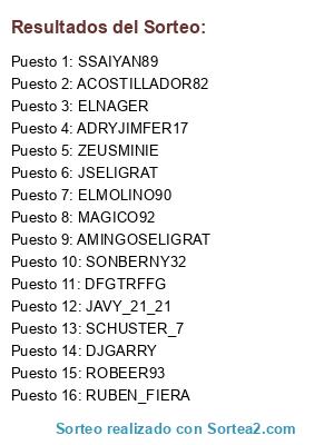Lista de participantes: DJGARRY , DFGTRFFG , JAVY_21_21 , SCHUSTER_7 (2 participaciones), RUBEN_FIERA (3 participaciones), ROBEER93 (4 participaciones), ACOSTILLADOR82 (5 participaciones), SSAIYAN89 (6 participaciones), ELMOLINO90 (7 participaciones), ELNAGER (8 participaciones), JSELIGRAT (9 participaciones), MAGICO92 (10 participaciones), SONBERNY32 (11 participaciones), ADRYJIMFER17 (12 participaciones), AMINGOSELIGRAT (13 participaciones), ZEUSMINIE (13 participaciones), ZEUSMINIE.