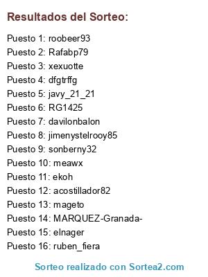 Lista de participantes: ekoh, elnager, MARQUEZ-Granada-, meawx, ruben_fiera, Rafabp79, mageto(2 participaciones), roobeer93(2 participaciones), acostillador82(4 participaciones), dfgtrffg(5 participaciones), javy_21_21(5 participaciones), davilonbalon(7 participaciones), jimenystelrooy85(8 participaciones), RG1425(9 participaciones), xexuotte(9 participaciones), sonberny32(11 participaciones).