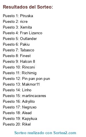 Lista de participantes: Linho, Tabasco, Pin pan pon pun, Halcon 8, Xemita, Outlander, martincaceres, Makmor11, Rikel, Finest, Fran Lizanco, Richimig, Kapykua, Adrylito, Alead, Negruxo, ricre, Ptruska, Pakiu, Rinconi.