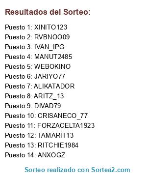 Lista de participantes: WEBOKINO, RVBNOO09, JARIYO77, ANXOGZ, TAMARIT13, FORZACELTA1923, RITCHIE1984, XINITO123, ALIKATADOR, IVAN_IPG, MANUT2485, ARITZ_13, DIVAD79, CRISANECO_77.