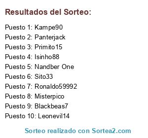 Lista de participantes: Kampe90, Panterjack, Leonevil14, Ronaldo59992, Blackbeas7, Isinho88, Sito33, Misterpico, Nandber One, Primito15.