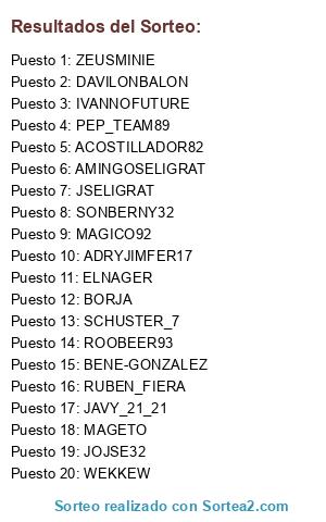 Lista de participantes: MAGETO, BENE-GONZALEZ, JOJSE32, WEKKEW, JAVY_21_21, RUBEN_FIERA(2 participaciones), ELNAGER(3 participaciones), SCHUSTER_7(4 participaciones), PEP_TEAM89(5 participaciones), ROOBEER93(5 participaciones), ACOSTILLADOR82(7 participaciones), ADRYJIMFER17(7 participaciones), BORJA(9 participaciones), JSELIGRAT(9 participaciones), ZEUSMINIE(11 participaciones), DAVILONBALON(12 participaciones), SONBERNY32(13 participaciones), AMINGOSELIGRAT(14 participaciones), MAGICO92(15 participaciones), IVANNOFUTURE(16 participaciones).