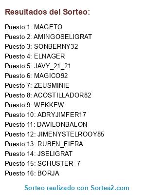 Lista de participantes: JAVY_21_21 , RUBEN_FIERA (2 participaciones), ELNAGER (3 participaciones), MAGETO (4 participaciones), SCHUSTER_7 (5 participaciones), ACOSTILLADOR82 (6 participaciones), DAVILONBALON (7 participaciones), ADRYJIMFER17 (8 participaciones), SONBERNY32 (9 participaciones), BORJA (10 participaciones), JSELIGRAT (11 participaciones), WEKKEW (12 participaciones), JIMENYSTELROOY85 (13 participaciones), ZEUSMINIE (14 participaciones), AMINGOSELIGRAT (15 participaciones), MAGICO92 (15 participaciones), MAGICO92.
