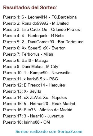 Lista de participantes: Kampe90 - Newcastle, DaniGomez90 - Bor.Dortmund, Near10 - Juventus, Panterjack - R.Betis, Hernan20 - Reak Madrid, Leonevil14 - FC.Barcelona, Ronaldo59992 - M.United, x karloS 5 x - PSG, Isinho88 - OM, Ese Cadiz Oe - Orlando Pirates, Baif0 - Malaga, Sito33 - Atletico de Madrid, ElFresco14 - Hercules, xX ZaVeL Xx - Napoles, Xx SpeerS xX - Everton, Dani Melou - M.City, Ferborrus - Milan, AbeeceedariO v2 - Sevilla.