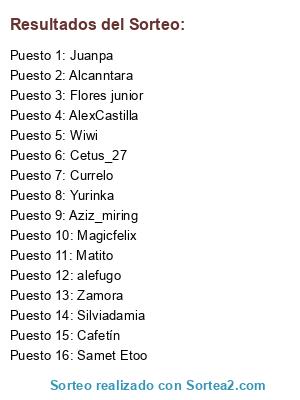 Lista de participantes: alefugo, Alcanntara, Wiwi, Zamora, Cetus_27, Aziz_miring, Yurinka, Matito, Samet Etoo, Silviadamia, AlexCastilla, Juanpa, Cafetín, Magicfelix, Currelo, Flores junior.