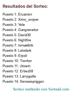 Lista de participantes: Erbez08, Senseispriggan, Lalodark, David30, Larryguille, Nightfire, Trenton, Ximo_cooper, Yele, Gangreneitor, Eruanion, Jitowin, Erpoli, Ismaelbtk.