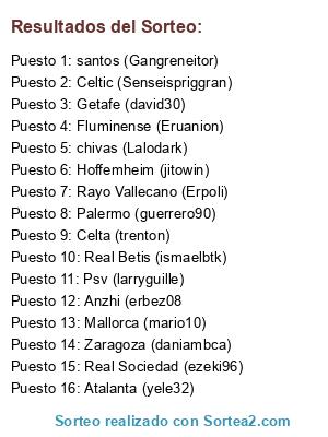 Lista de participantes: Anzhi (erbez08, Celtic (Senseispriggran), chivas (Lalodark), Getafe (david30), Psv (larryguille), Palermo (guerrero90), Celta (trenton), Zaragoza (daniambca), Atalanta (yele32), santos (Gangreneitor), Fluminense (Eruanion), Hoffemheim (jitowin), Rayo Vallecano (Erpoli), Real Betis (ismaelbtk), Real Sociedad (ezeki96), Mallorca (mario10).