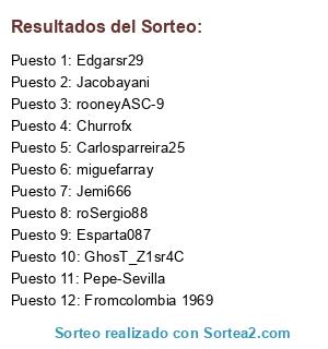 Lista de participantes: Esparta087, GhosT_Z1sr4C, Jacobayani, Carlosparreira25, Fromcolombia 1969, Jemi666, Churrofx, roSergio88, Pepe-Sevilla, rooneyASC-9, Edgarsr29, miguefarray.