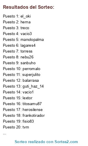 Lista de participantes: doble00, xikitina, torress, lagares4, sanbuho, granadacf, Danuu, superjulito, kalimotxo, tomasin, TIN_206, perromalo, balarrasa, guti_haz_14, peperecre, frankotirador, herosilense, fisio83, el_oki, vacio1, lextor, vacio2, titosamu87, herna, treco, nebu26, chala, vacio3, tvm, manolopalma.