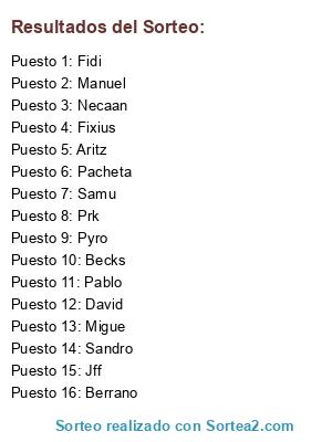 Lista de participantes: Javizaki >, Oskis >, Alex >, carnedebil >, chery >, ostrix >, Rugu >, Toni >, sapo >, vifu >, Jomalk >, rwaben >.