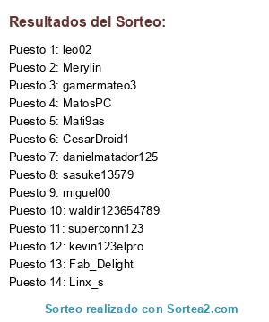Lista de participantes: kevin123elpro, miguel00, Merylin, leo02, Mati9as, Fab_Delight, Linx_s, superconn123, CesarDroid1, danielmatador125, sasuke13579, waldir123654789, MatosPC, gamermateo3.