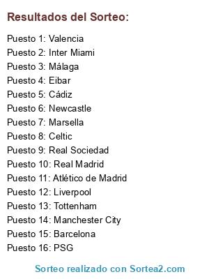Lista de participantes: Atlético de Madrid, Manchester City, Málaga, Newcastle, Barcelona, Marsella, Celtic, Eibar, Liverpool, Real Madrid, Cádiz, Valencia, PSG, Real Sociedad, Inter Miami, Tottenham.