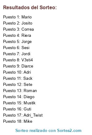 Lista de participantes: Jorge, Adri_Twist, Adri, Jordi, Diarce, Mike, Riera, Roman, Mario, Mustik, Diego, Sesi, Josito, Guti, Sack, Correa, Sete, V3sti4.