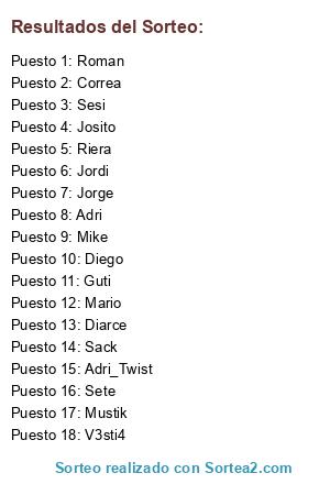 Lista de participantes: Jorge, Adri_Twist, Adri, Jordi, Diarce, Mike, Riera, Roman, Mario, Mustik, Diego, Sesi, Josito, Guti, Sack, Correa, Sete, V3sti4.