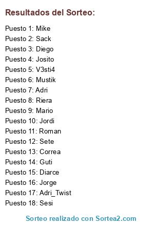 Lista de participantes: Jorge, Adri_Twist, Adri, Jordi, Diarce, Mike, Riera, Roman, Mario, Mustik, Diego, Sesi, Josito, Guti, Sack, Correa, Sete, V3sti4.