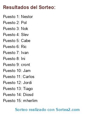 Lista de participantes: Ivan, Nok, Cabe, Ric, Carlos, cront, mherlim, Slev, Ini, Jordi, Pol, Jam, Diosd, Tiago, Nestor.