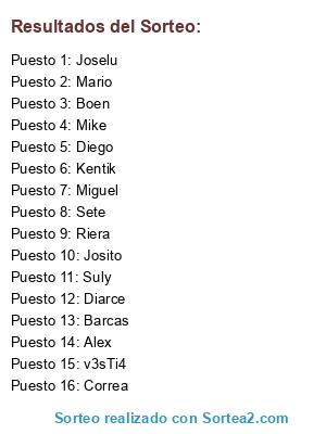 Lista de participantes: Miguel, Barcas, Mario, Diego, Diarce, Alex, v3sTi4, Mike, Joselu, Josito, Kentik, Sete, Correa, Suly, Riera, Boen.
