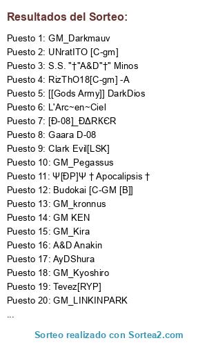 Lista de participantes: killJ17 C-gm(A), RizThO18[C-gm] -A, MASTER GM_MagicBoy, [Ð-08]_ĐΔRКЄR, L'Arc~en~Ciel, Gaara D-08, Ψ[ĐP]Ψ † Apocalipsis †, GM KEN, GM_Kyoshiro, UNratITO [C-gm], GM_Kira, GM_Pegassus, Clark Evil[LSK], [PrO] Killer, Budokai [C-GM [B]], GM_kronnus, [PrO]Kiryu †RA†, GM_Darkmauv, A&D Anakin, [[Gods Army]] DarkDios, A&D Drag, Espada Ulquiorra, Darkcore[SVyM], [[Gods Army]] Raper, Tevez[RYP], ShadoWing[SVyM], S.S. "†"A&D"†" Minos, GM_LINKINPARK, AyDShura, Arkngel_Zero1 [KOF], VERGIL-LSK, [Pr0] ▼John Smit▲.