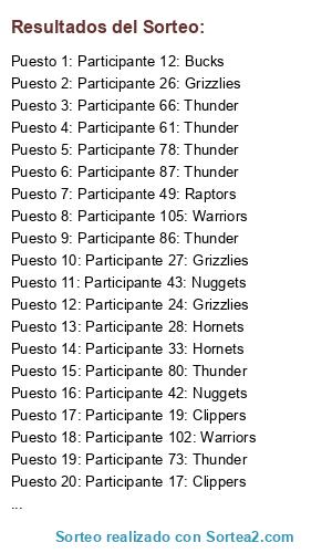 Lista de participantes: Participante 1: Bucks, Participante 2: Bucks, Participante 3: Bucks, Participante 4: Bucks, Participante 5: Bucks, Participante 6: Bucks, Participante 7: Bucks, Participante 8: Bucks, Participante 9: Bucks, Participante 10: Bucks, Participante 11: Bucks, Participante 12: Bucks, Participante 13: Clippers, Participante 14: Clippers, Participante 15: Clippers, Participante 16: Clippers, Participante 17: Clippers, Participante 18: Clippers, Participante 19: Clippers, Participante 20: Clippers, Participante 21: Clippers, Participante 22: Grizzlies, Participante 23: Grizzlies, Participante 24: Grizzlies, Participante 25: Grizzlies, Participante 26: Grizzlies, Participante 27: Grizzlies, Participante 28: Hornets, Participante 29: Hornets, Participante 30: Hornets, Participante 31: Hornets, Participante 32: Hornets, Participante 33: Hornets, Participante 34: Hornets, Participante 35: Hornets, Participante 36: Hornets, Participante 37: Hornets, Participante 38: Hornets, Participante 39: Nuggets, Participante 40: Nuggets, Participante 41: Nuggets, Participante 42: Nuggets, Participante 43: Nuggets, Participante 44: Nuggets, Participante 45: Nuggets, Participante 46: Nuggets, Participante 47: Raptors, Participante 48: Raptors, Participante 49: Raptors, Participante 50: Raptors, Participante 51: Raptors, Participante 52: Raptors, Participante 53: Raptors, Participante 54: Raptors, Participante 55: Raptors, Participante 56: Raptors, Participante 57: Raptors, Participante 58: Thunder, Participante 59: Thunder, Participante 60: Thunder, Participante 61: Thunder, Participante 62: Thunder, Participante 63: Thunder, Participante 64: Thunder, Participante 65: Thunder, Participante 66: Thunder, Participante 67: Thunder, Participante 68: Thunder, Participante 69: Thunder, Participante 70: Thunder, Participante 71: Thunder, Participante 72: Thunder, Participante 73: Thunder, Participante 74: Thunder, Participante 75: Thunder, Participante 76: Thunder, Participante 77: Thunder, Participante 78: Thunder, Participante 79: Thunder, Participante 80: Thunder, Participante 81: Thunder, Participante 82: Thunder, Participante 83: Thunder, Participante 84: Thunder, Participante 85: Thunder, Participante 86: Thunder, Participante 87: Thunder, Participante 88: Timberwolves, Participante 89: Timberwolves, Participante 90: Timberwolves, Participante 91: Timberwolves, Participante 92: Timberwolves, Participante 93: Timberwolves, Participante 94: Timberwolves, Participante 95: Timberwolves, Participante 96: Timberwolves, Participante 97: Timberwolves, Participante 98: Warriors, Participante 99: Warriors, Participante 100: Warriors, Participante 101: Warriors, Participante 102: Warriors, Participante 103: Warriors, Participante 104: Warriors, Participante 105: Warriors.