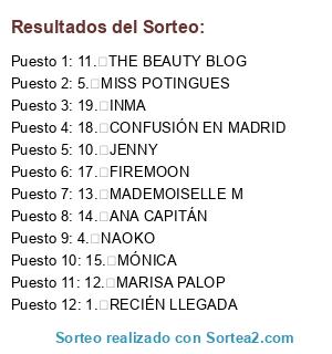 Lista de participantes: 1. RECIÉN LLEGADA, 2. KRIATURA MALDITA, 3. LICIA AGULLO, 4. NAOKO, 5. MISS POTINGUES, 6. BRANCA DE NEVE, 7. SUPERFICIALES, 8. PATRIZANA, 9. YOLANDA AGUADO, 10. JENNY, 11. THE BEAUTY BLOG, 12. MARISA PALOP, 13. MADEMOISELLE M, 14. ANA CAPITÁN, 15. MÓNICA, 16. CRISTINA PS, 17. FIREMOON, 18. CONFUSIÓN EN MADRID, 19. INMA.