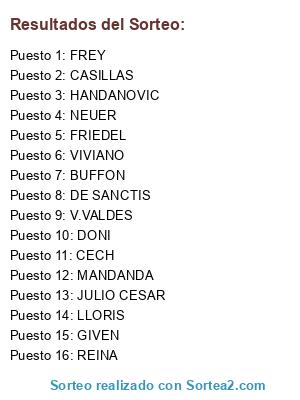 Lista de participantes: BUFFON, CASILLAS, JULIO CESAR, NEUER, V.VALDES, CECH, FREY, FRIEDEL, LLORIS, HANDANOVIC, REINA, GIVEN, VIVIANO, DE SANCTIS, MANDANDA, DONI.