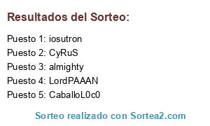 Lista de participantes: iosutron (3), TheBigCana (1), ebayo_origin (3), almighty (12), CaballoL0c0 (7), Tzeen (11), Delfast (9), LordPAAAN (10), Valkiria (7), Corri**** (1), xR0CKSoLiDx (2), CyRuS (6), AM4rtineZ (3), Tantalior (5), SergioCheng (6), karnaza1972 (5), Gavilo (3), Qzeron (1), Diabol(3).