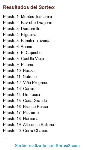Lista de participantes: Garzón, Bouza, Pisano, Viña Progreso, Favretto Dragone, Bracco Bosca, Narbona, Dardanelli, Alto de la Ballena, Familia Traversa, Marichal, Viña Edén, Juanicó, Cerro Chapeu, Casa Grande, El Capricho, Castillo Viejo, Artesana, Montes Toscanini, Nabune, De Lucca, Pizzorno, Carrau, Filgueira, Ariano.