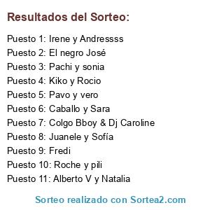 Lista de participantes: Juanele y Sofía, Roche y pili, Pachi y sonia, Pavo y vero, Alberto V y Natalia, Fredi, Kiko y Rocio, Irene y Andressss, Caballo y Sara, Colgo Bboy & Dj Caroline, El negro José.
